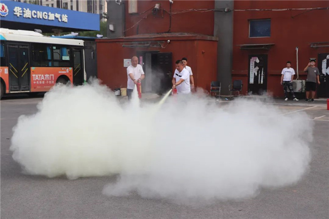 培訓結束后,大家來到通運公司院內,由李教官為大家進行消防、反恐方面的指導,并模擬公交車輛突發火災事故時,駕駛員應如何采取緊急停車、開啟車門、切斷電源、疏散乘客到安全位置等應急措施,以及如何正確使用滅火器進行滅火的實操演練。