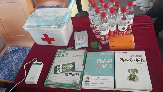 車身懸掛著“以夢為馬,不負(fù)韶華,中考砥礪前行”“九年寒窗,在此一搏,沖刺中考,奮斗今朝”等祝福條幅,車廂內(nèi),飲用水、充電寶、文具、應(yīng)急藥物、雨傘、紙巾以及書籍應(yīng)有盡有。不一會(huì)兒,車內(nèi)就坐了不少家長,對此,家長們很是感動(dòng),感謝車隊(duì)和王師傅提供的休息場所。
